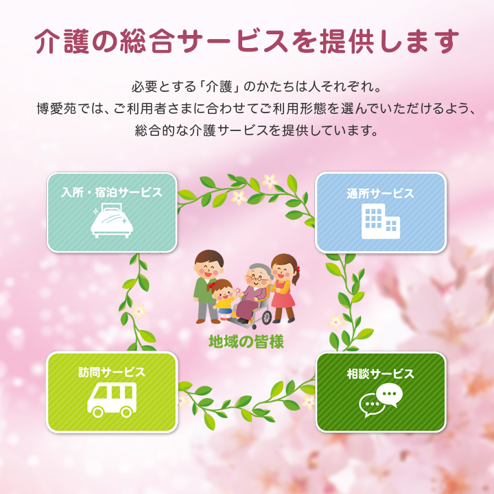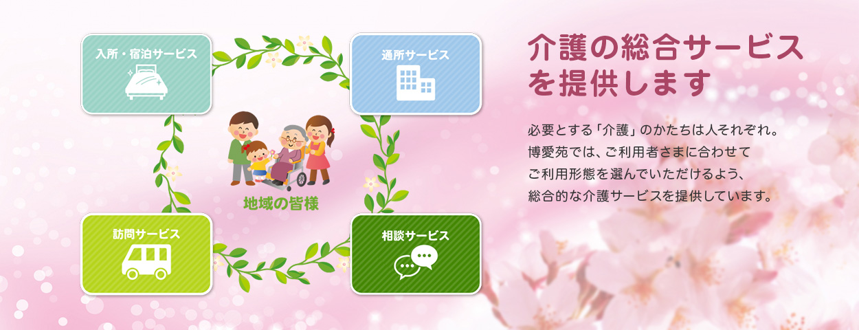 「介護が必要になっても住み慣れた自宅や地域で安心して暮らし続けたい・・・」誰もが抱くこの願いを実現するため、博愛苑では入所・通所・訪問・宿泊・相談の総合サービスを提供しています。