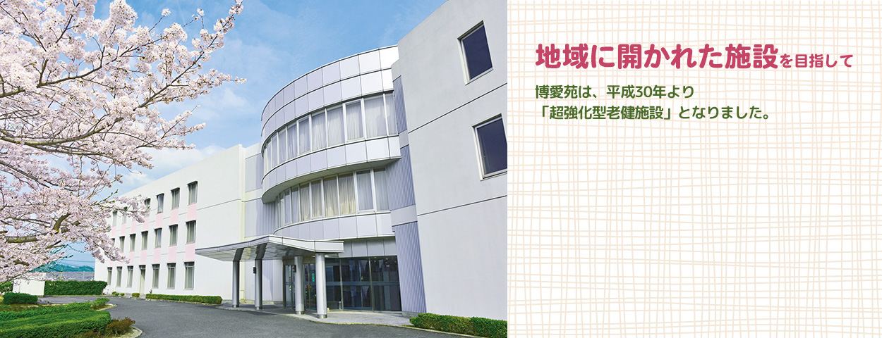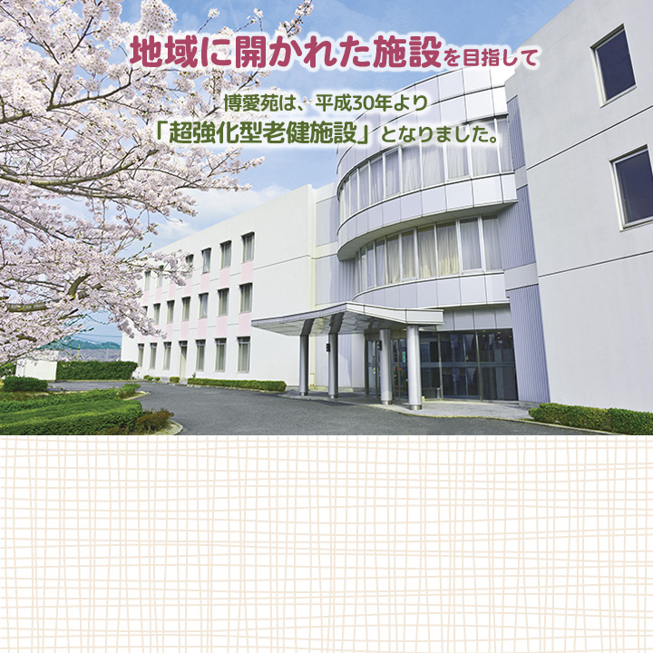 博愛苑は在宅強化型(超強化型)老健施設です。医学的管理の下で一日も早くご家庭に復帰できるように、家庭復帰のための機能訓練や療養に必要な看護・介護を中心とした医療ケアと日常生活サービスを提供します。